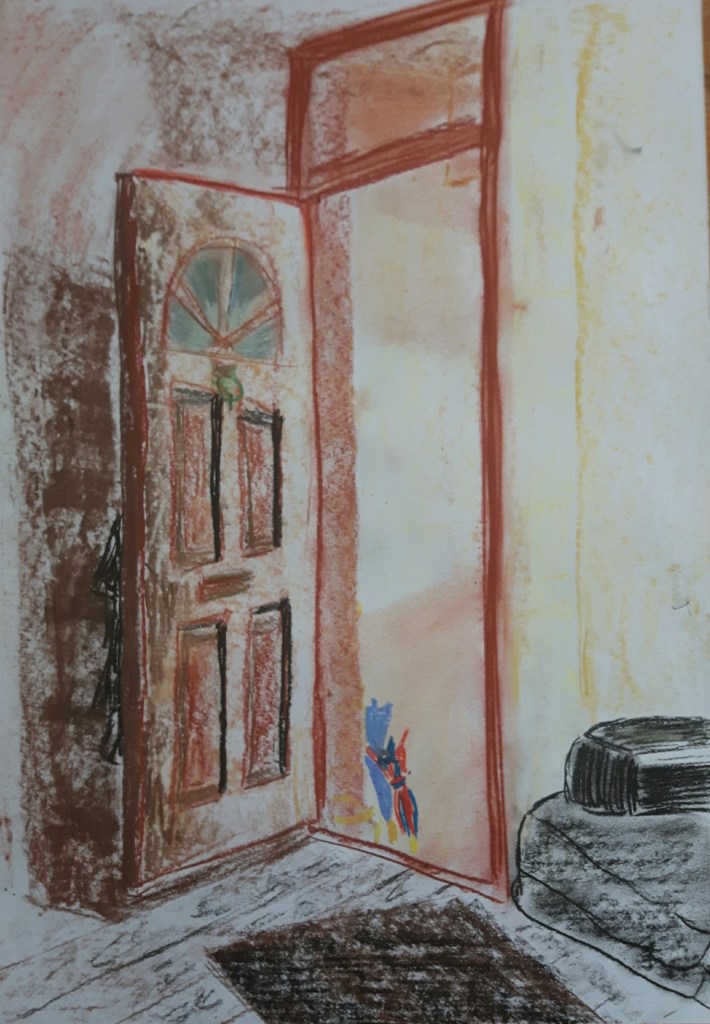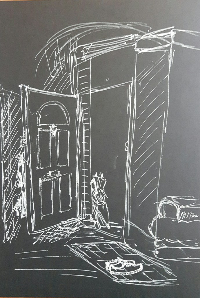 I was sure I’d like to draw an interior for this assignment however for a short time I considered some half-withered flowers in a vase. When I finally decided that it must be something else, I started roaming in the rooms with no success for a while. I sat down helplessly in the living room with a what-am-I-gonna-do face and then I saw it. The door was wide open because I was waiting for the postman (the bell isn’t working) and the lights came through the outer door, two umbrellas peeped out from our ridiculously small ante-room, the scene looked interesting.