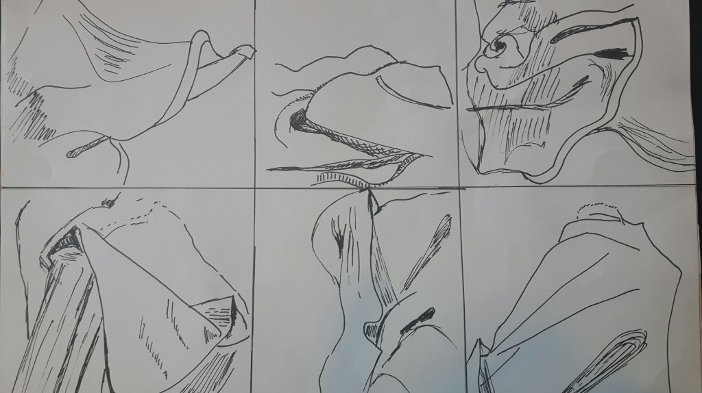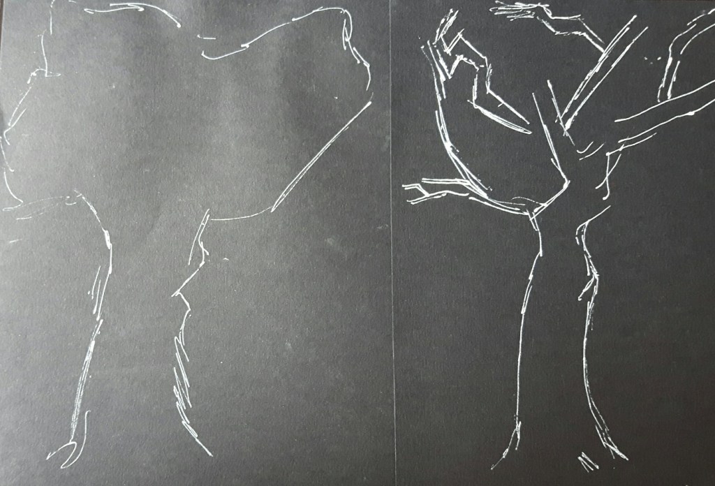 For this exercise I started with some very simplified sketches with white fine pen on black paper.