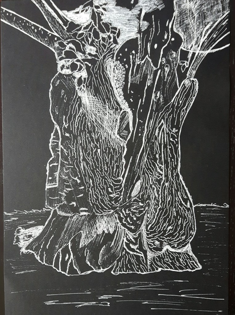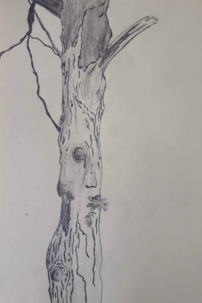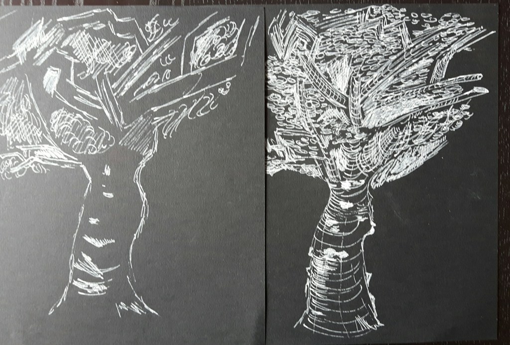 I had to draw the next one from a photo due to this challenging weather and to be honest that applies for most of my drawings in the “Expanse” part for the same sad reason. Luckily I have plenty of pictures of parks, forests and landscapes to choose from. The first was an interesting piece to draw, the second one is a larger tree I tried to add shades with splashing water on the paper with not much success.