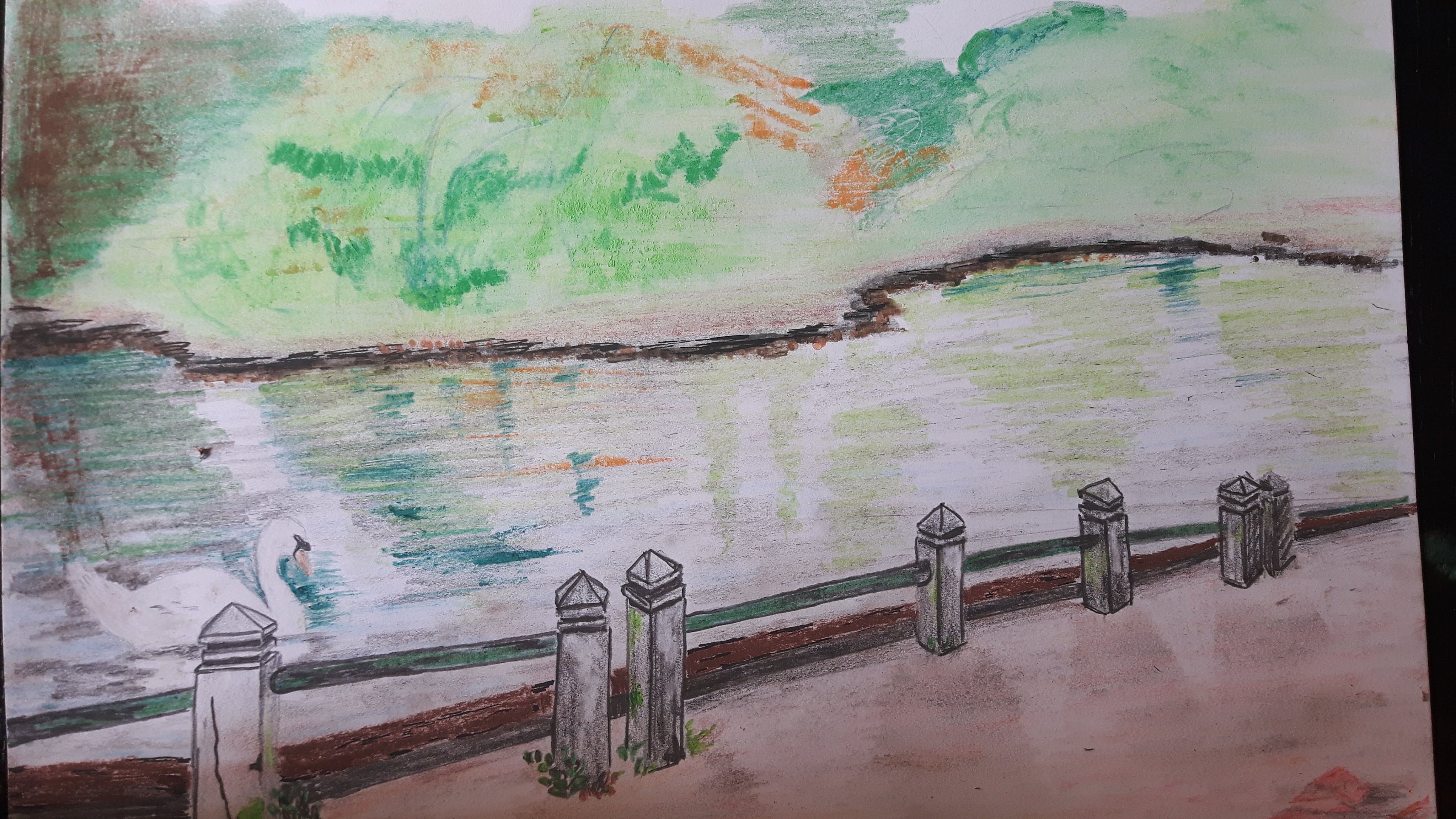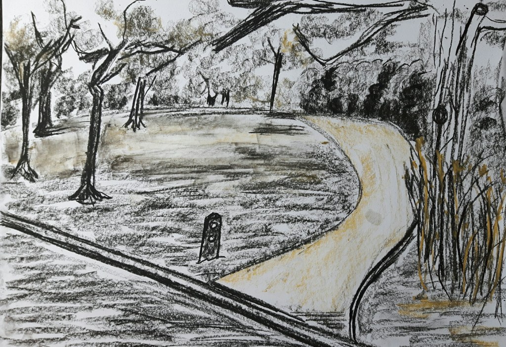I tried to simplify with repetition of simple forms creating the flowers’ heads on the first and the washed line shaping the edge of the lake on the second drawing. I sharpened the focus on the closer items (the flowers/the small concrete columns) with detailed sketching and used more soft smudging for the background. On the first picture I thought to show a bit more dramatic effect where the light fell on the ground with not only leaving the clear blank white but overemphasizing it with bright yellow strokes and shades. On the second one capturing the shadows of the columns were more successful comparing to the mirrored shades of the trees on the lake’s surface. If I was to do it again I would definitely do more thumbnail sketches to be more confident with the foreground part.