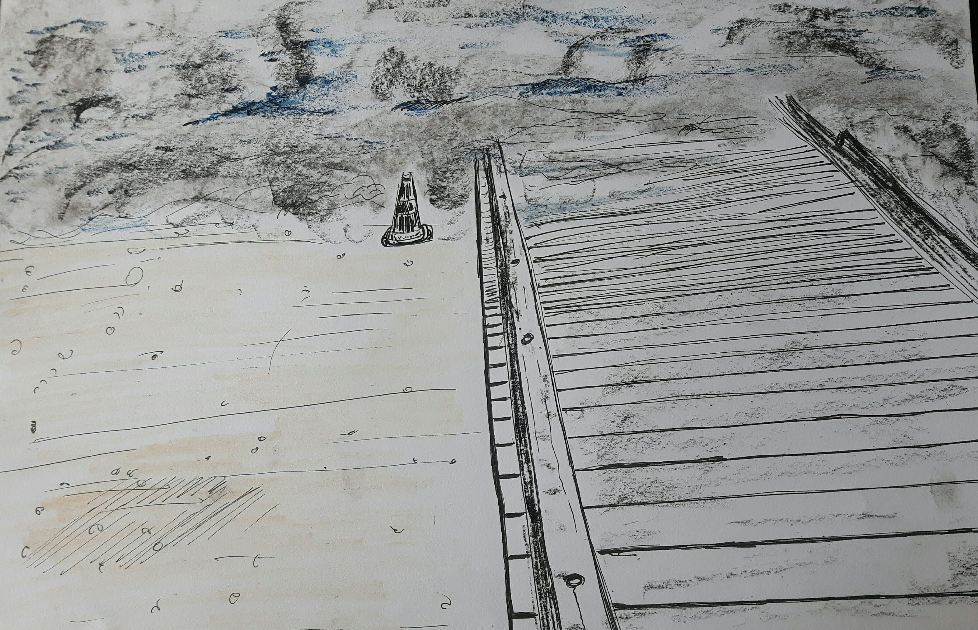This is a view from my bedroom window with fine pen, pastel and pencil. Using soft media worked better than a pen drawing probably because the misty background.