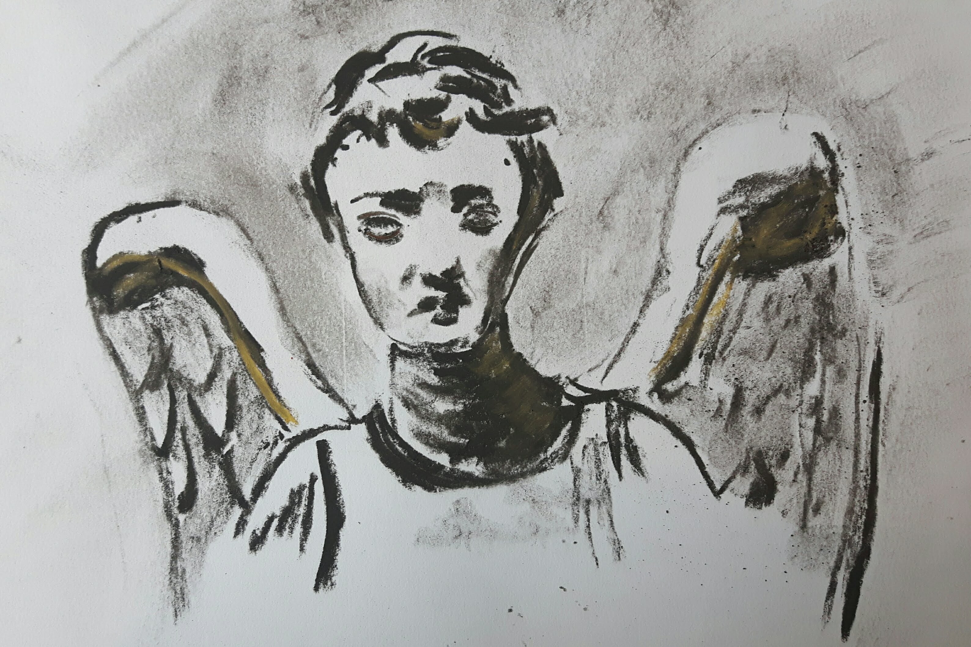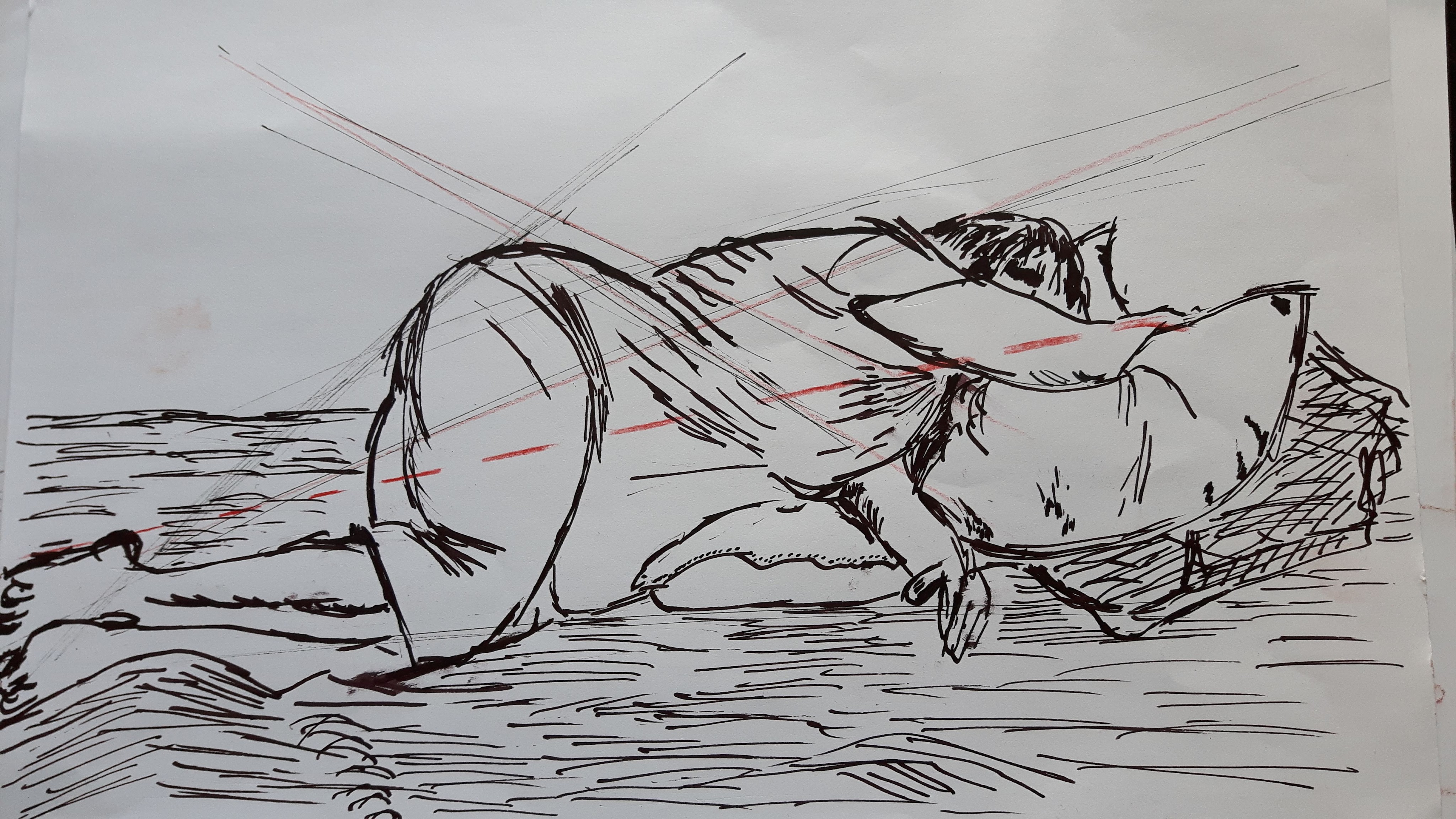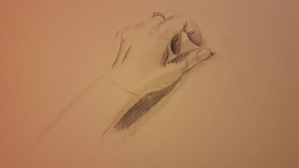 I think the composition looks balanced and I was quite happy with the tones and foreshortening of the lower body part. But then the left arm and the head went completely wrong. I tried to erase them both and draw again differently but it was just getting worse with each attempt.