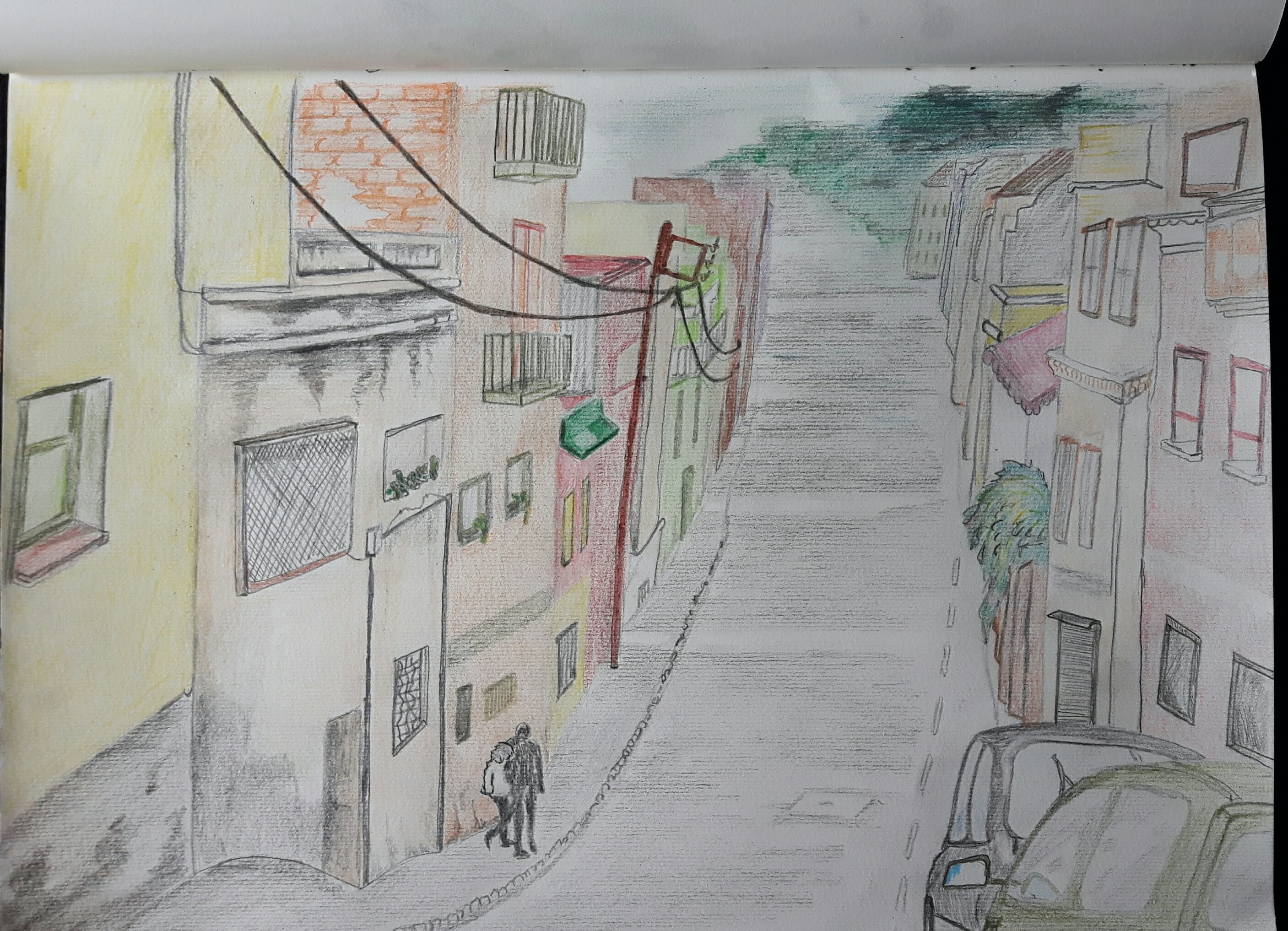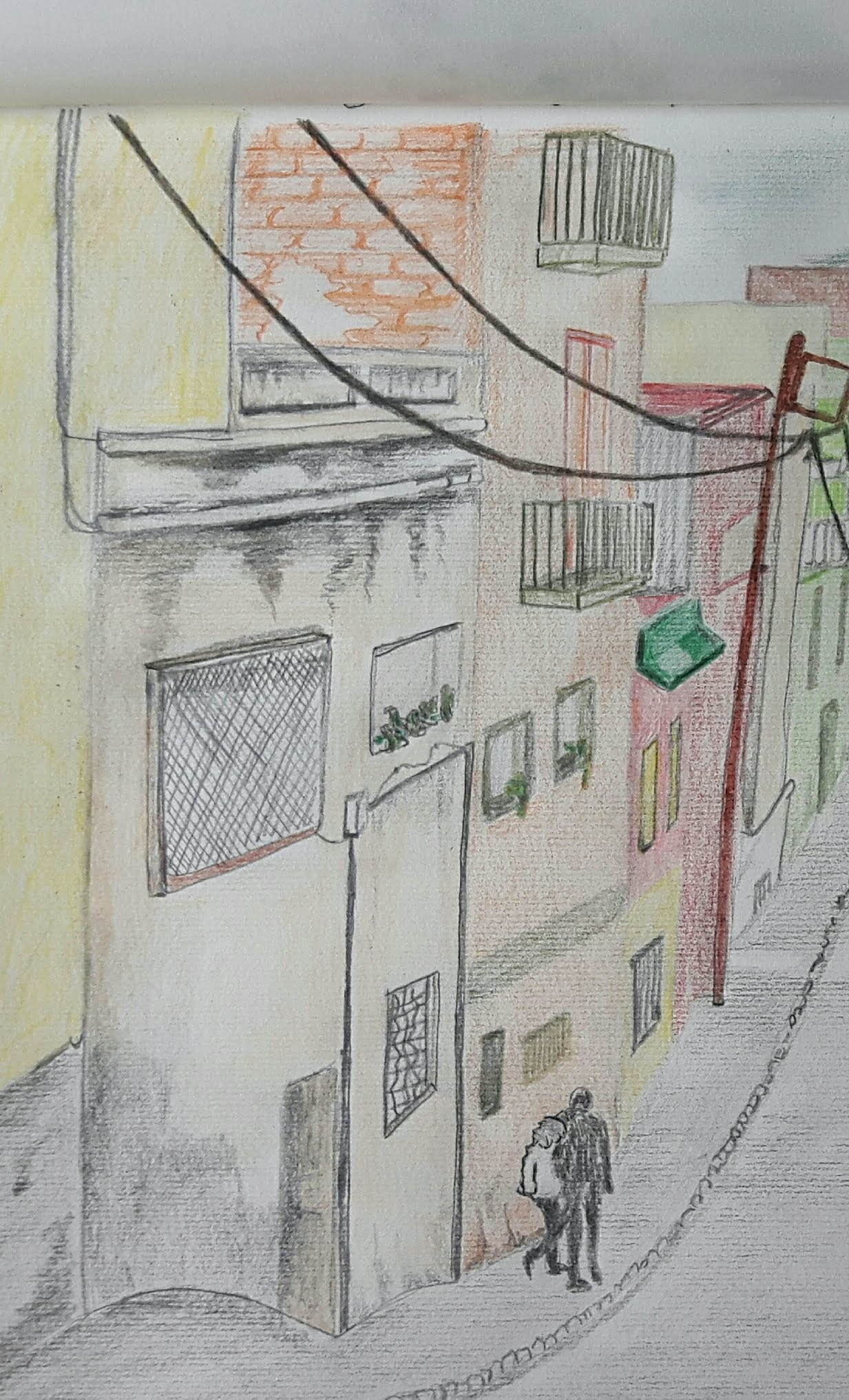 I found a photo of a colourful, long downhill street in Barcelona which I really liked. I put the line drawing in pencil just to get the perspective and proportions.