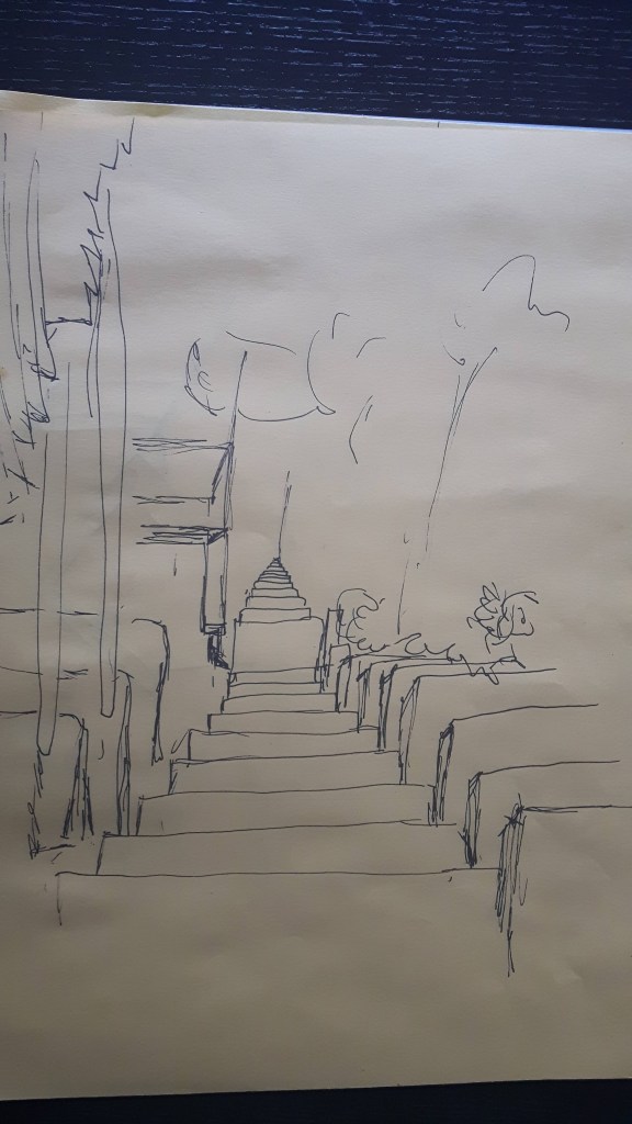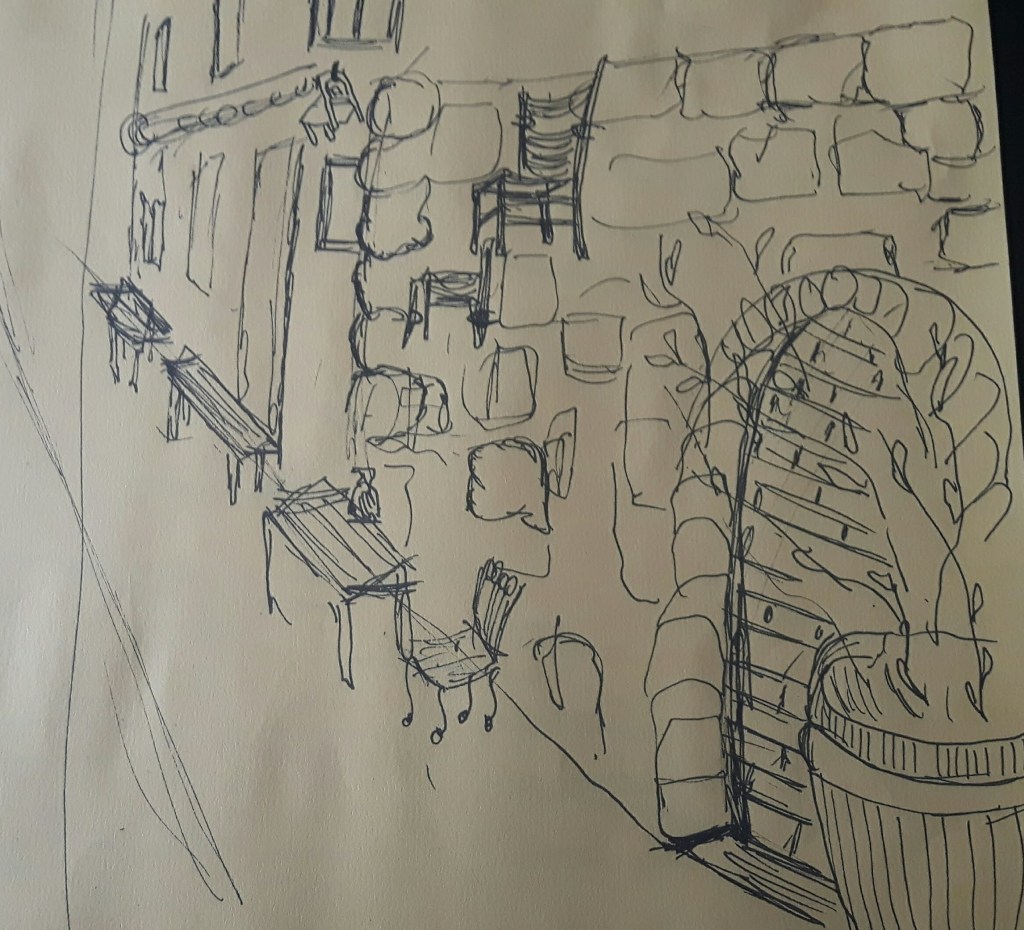 The cottage above was quite old, also this sketch lacks a bit of depth. The small bushes next to the path were almost black on the second one as dusk came soon and that time of a day the background had a sharp silhouette that I could not really catch well but didn’t want to rub out. On the third one, the light comes from left what I tried to indicate with yellowish smear marks on the ground. The fourth one..well, I know that is a bit far from the original exercise (also a bit overworked for this part) but she was there and that was an offer I can’t refuse…