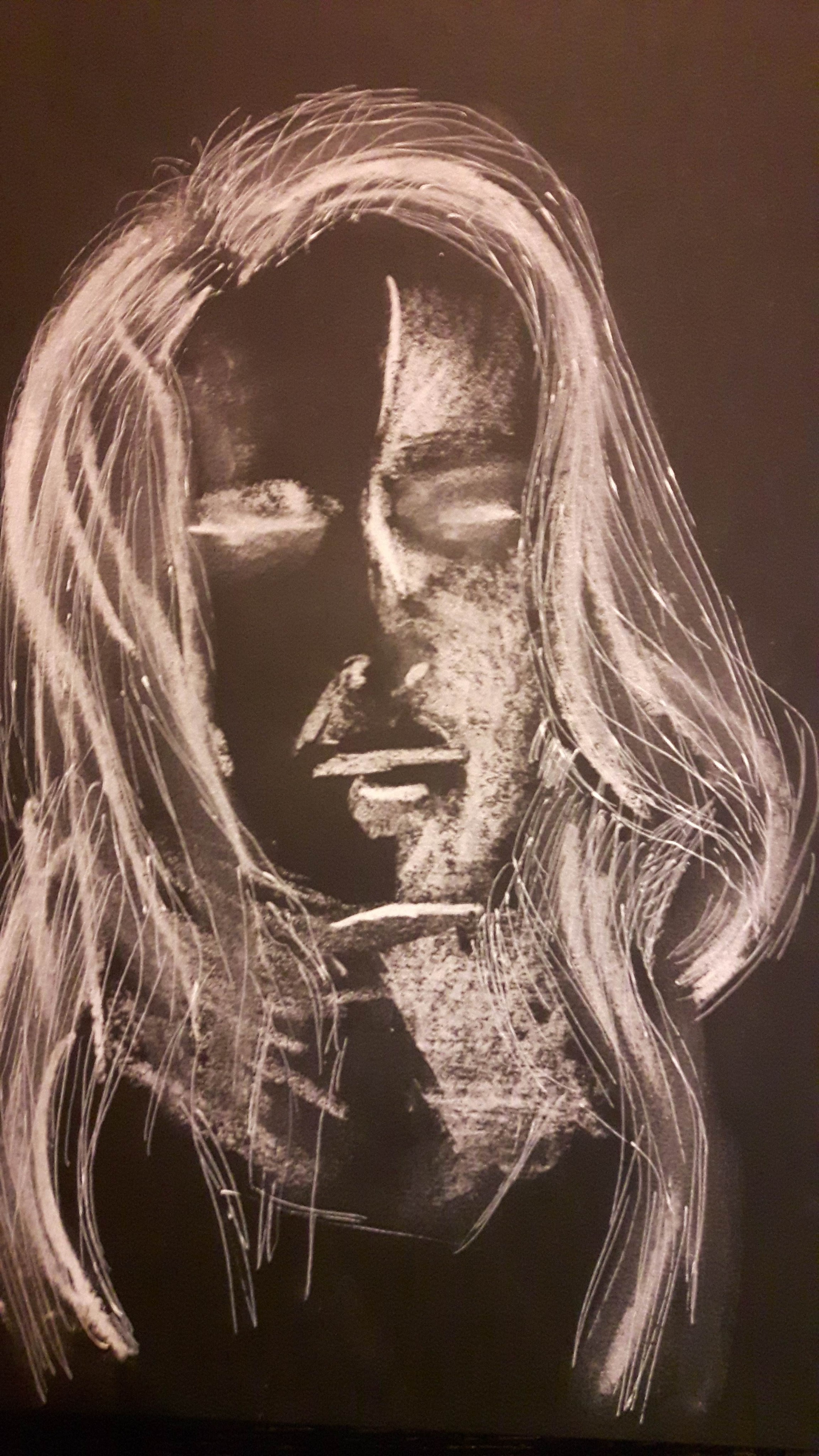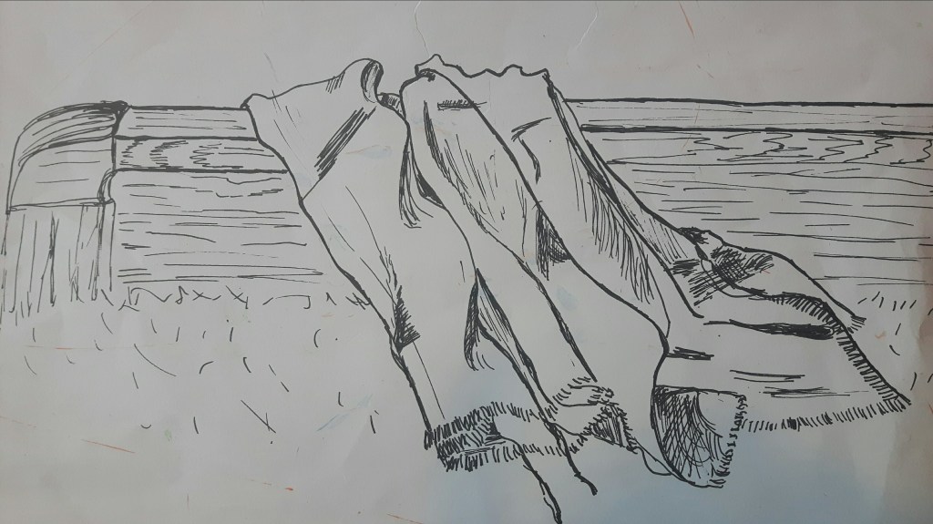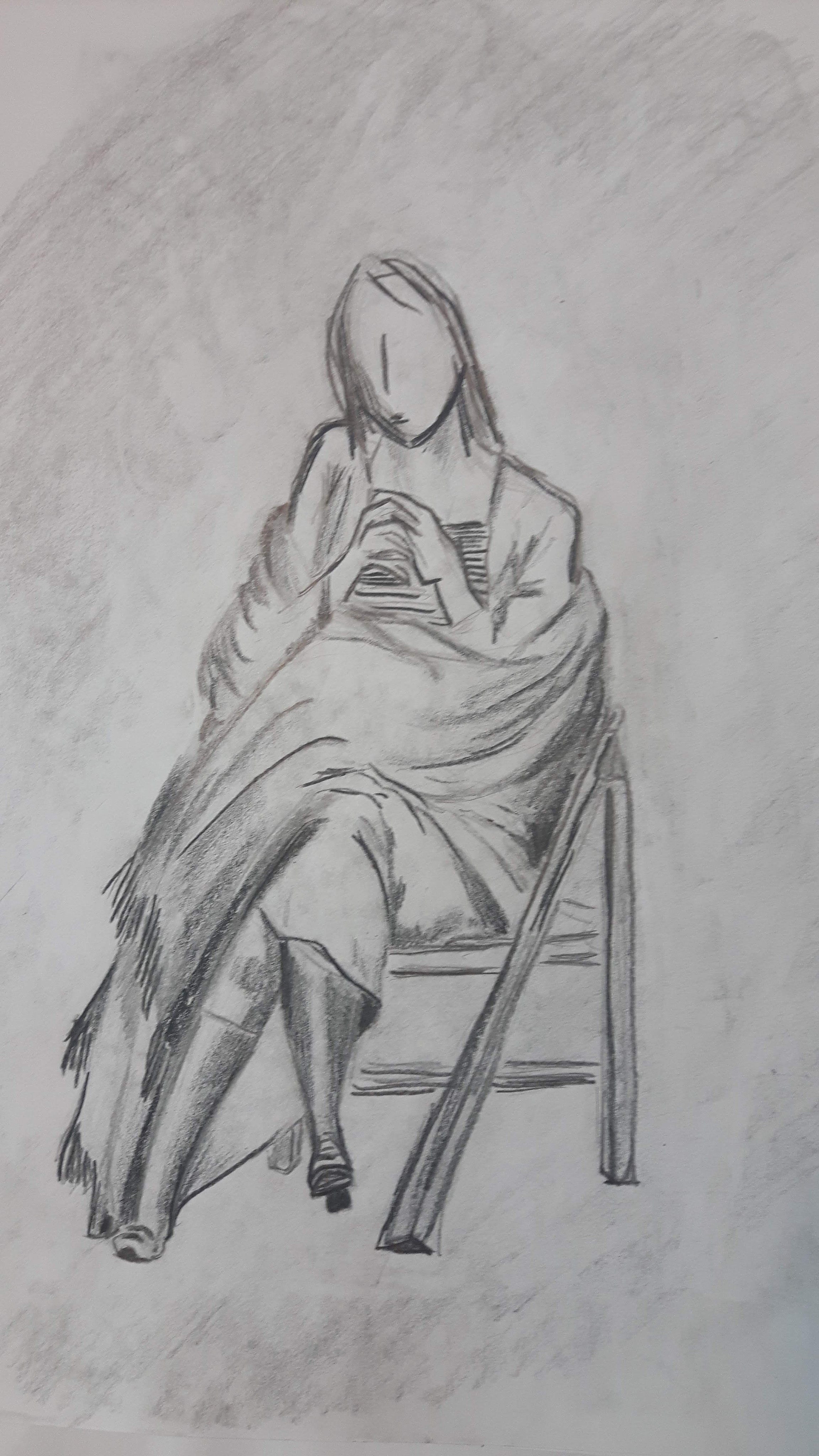Seated figure wearing a plain and pale coloured shawl. I couldn’t find anybody to sit for me at this time so I found a suitable picture online. I used 2B-3B pencil and black Inktense for this drawing.