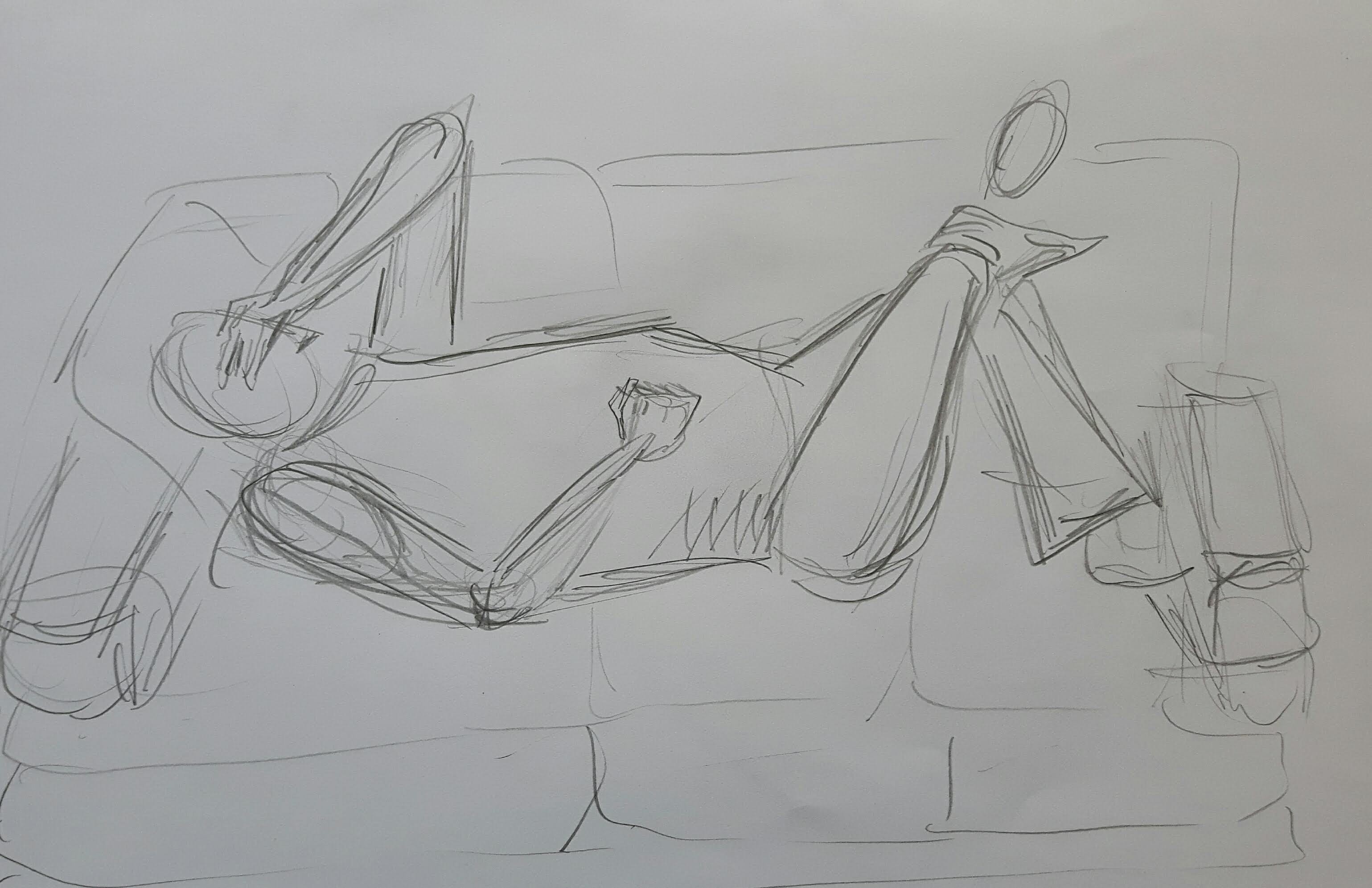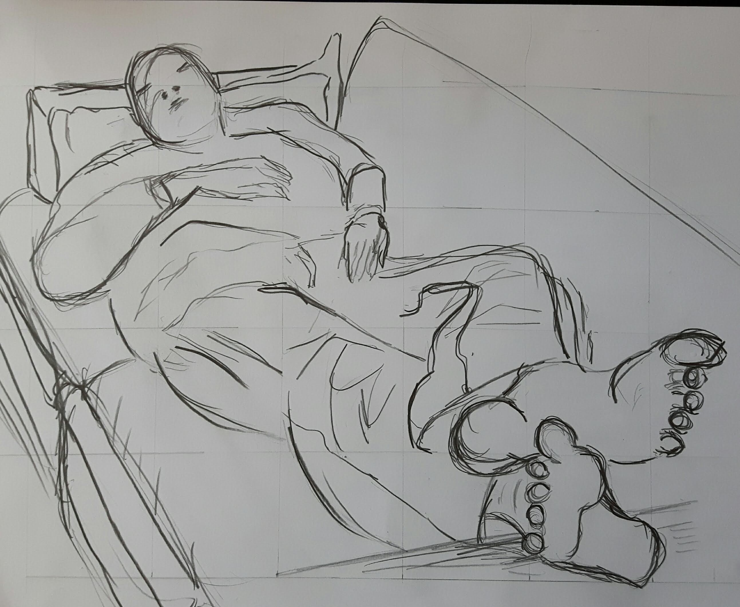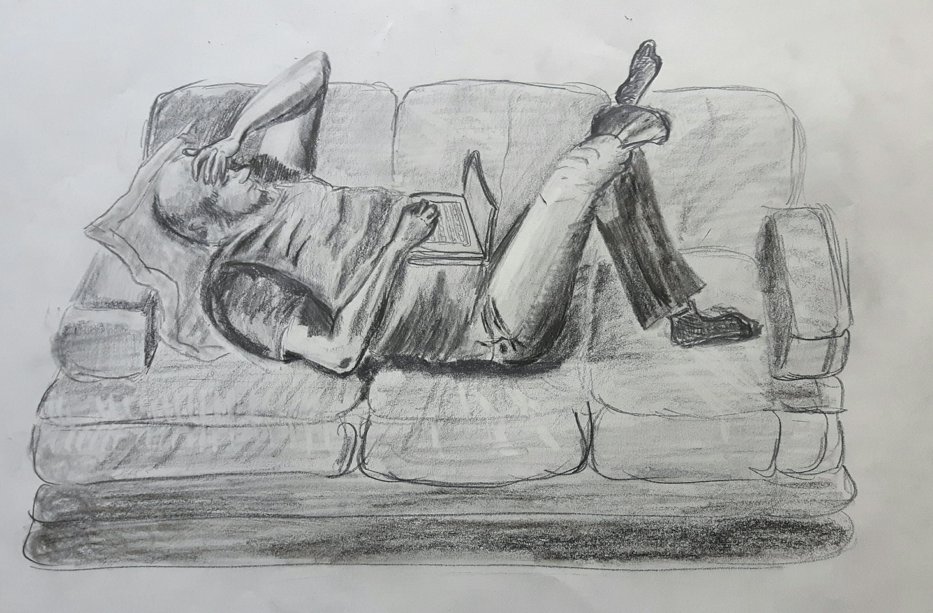 My model wore a jumper and jeans lounging on a couch facing me from the foot end. Natural light came from the window behind his head. I used pencils/charcoal for the final drawing. On the first sketch I outlined the basic shapes.