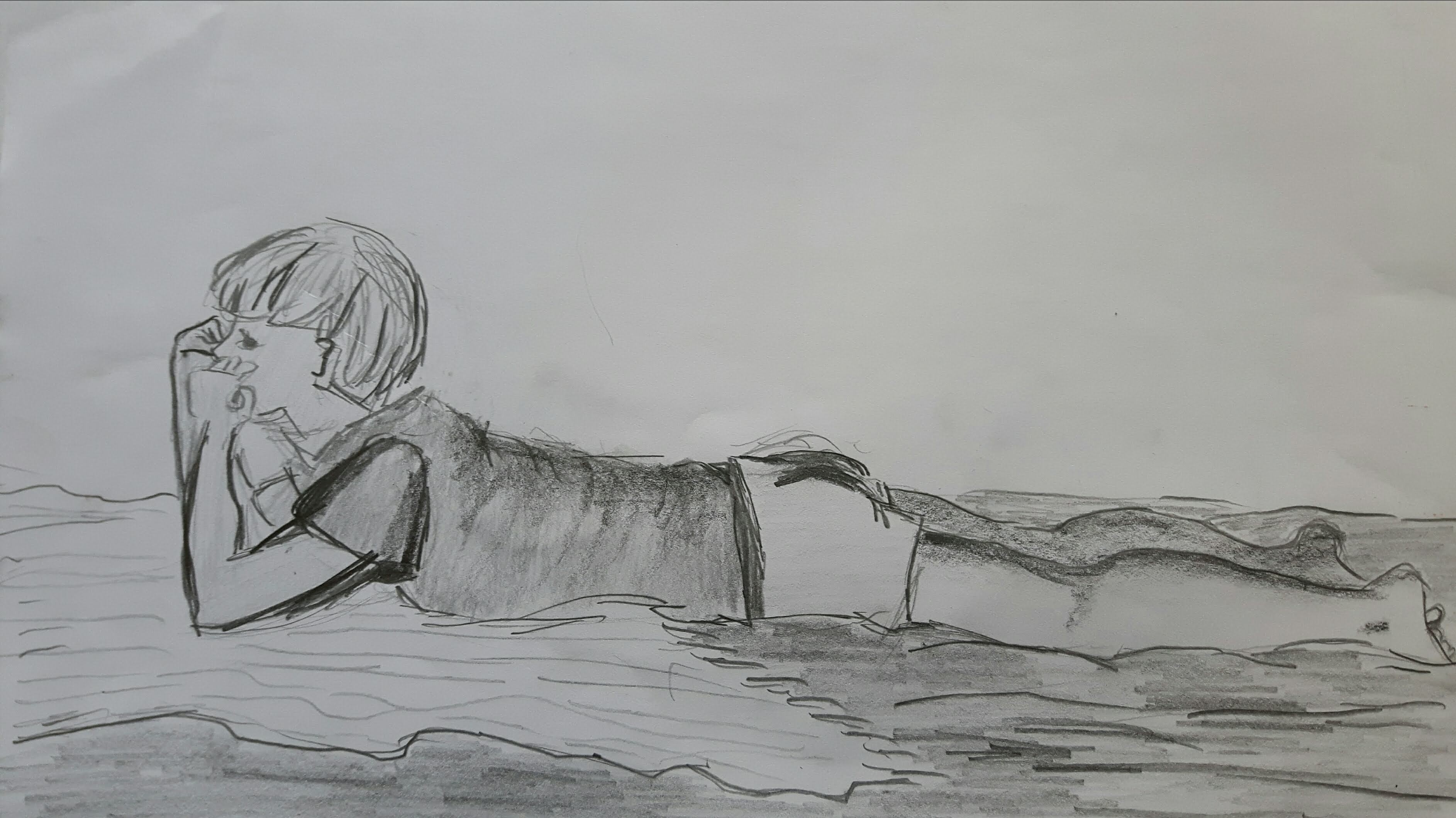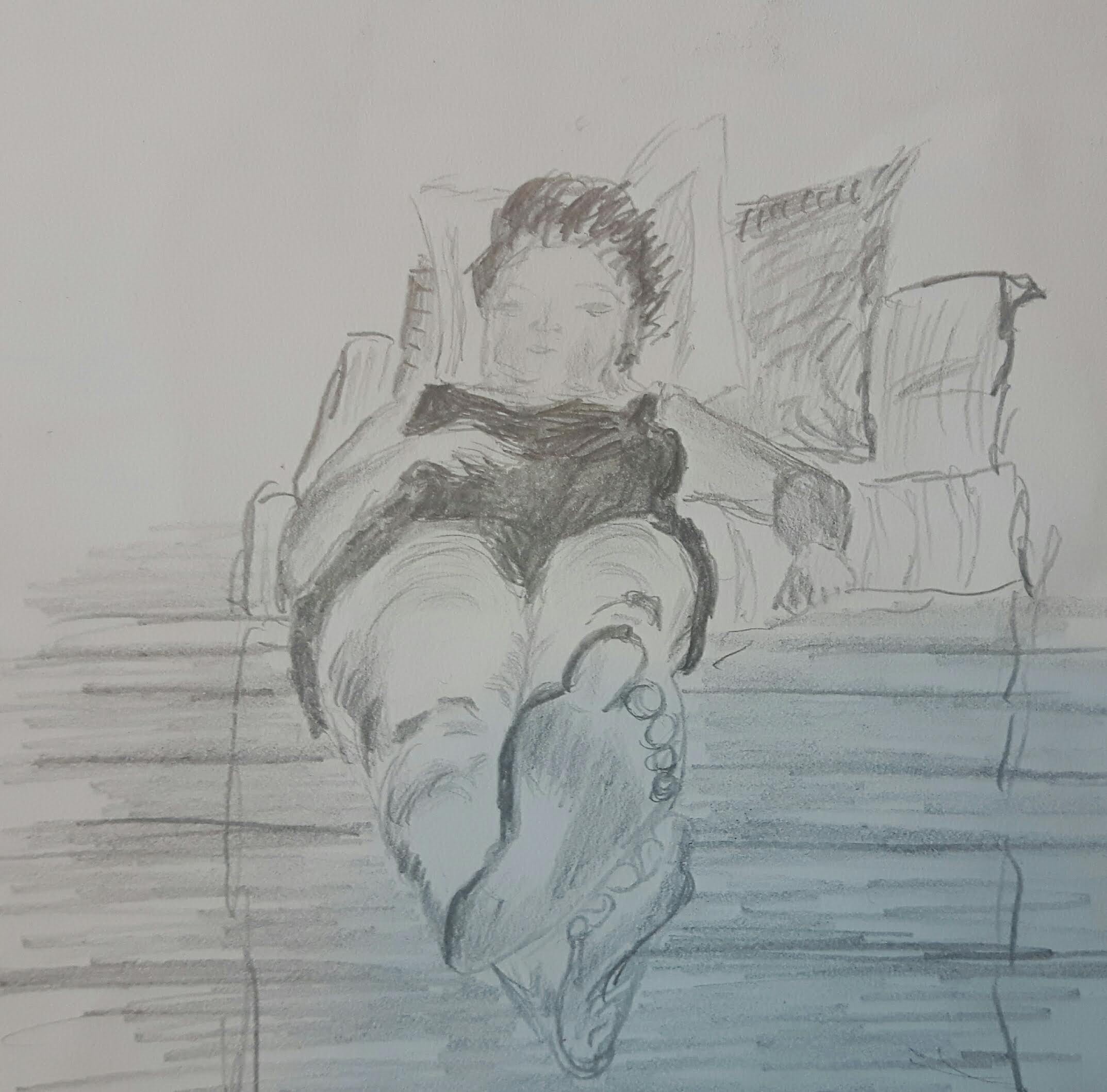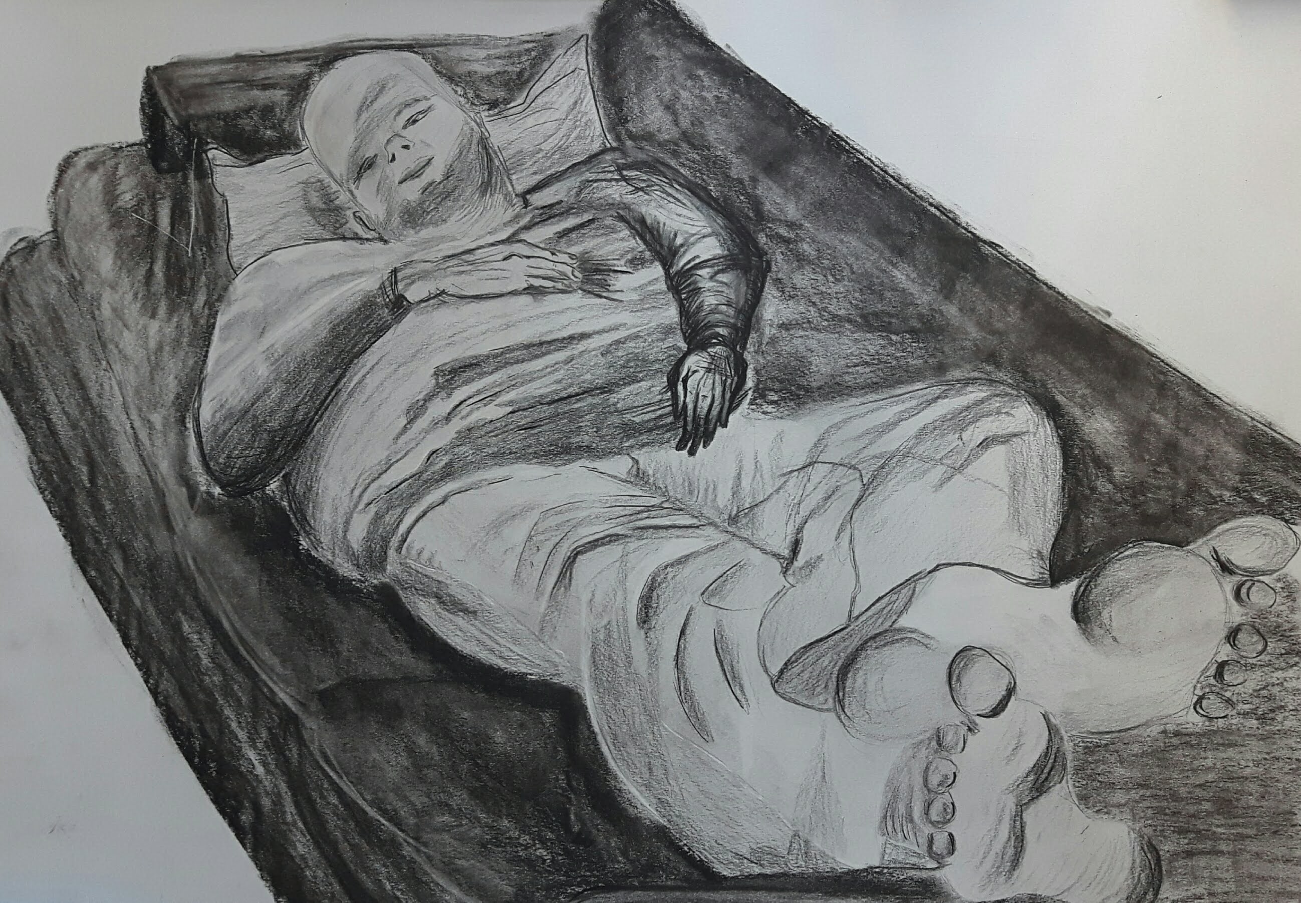 My model wore a jumper and jeans lounging on a couch facing me from the foot end. Natural light came from the window behind his head. I used pencils/charcoal for the final drawing. On the first sketch I outlined the basic shapes.