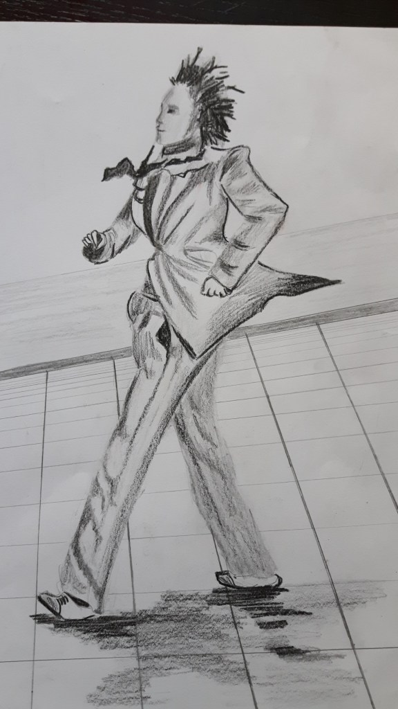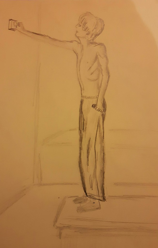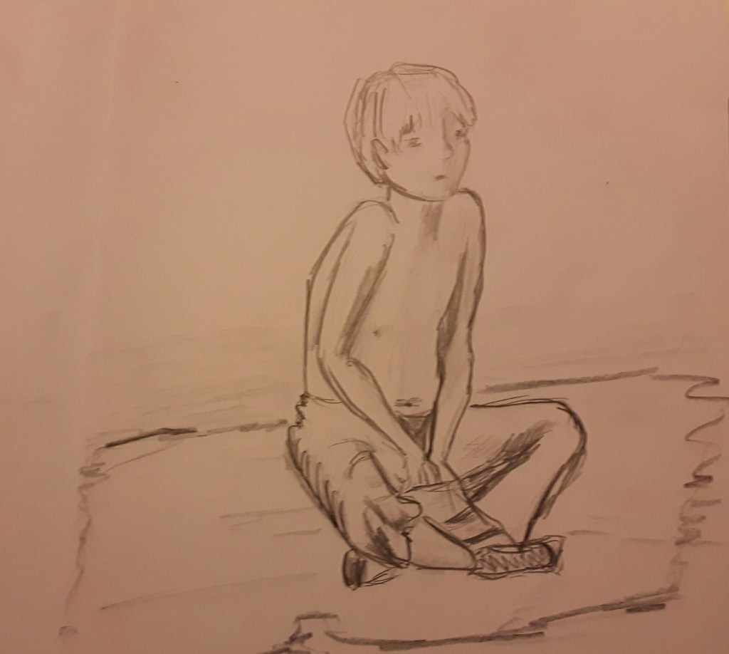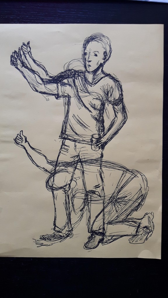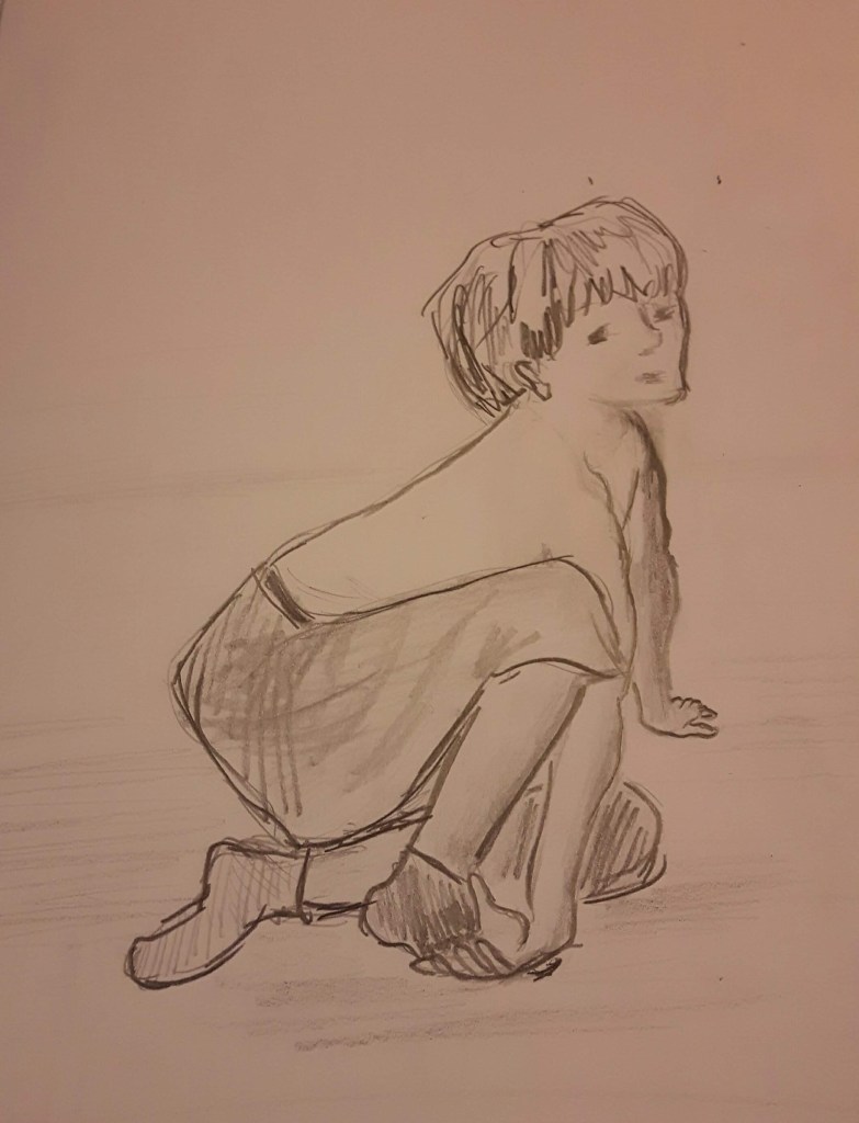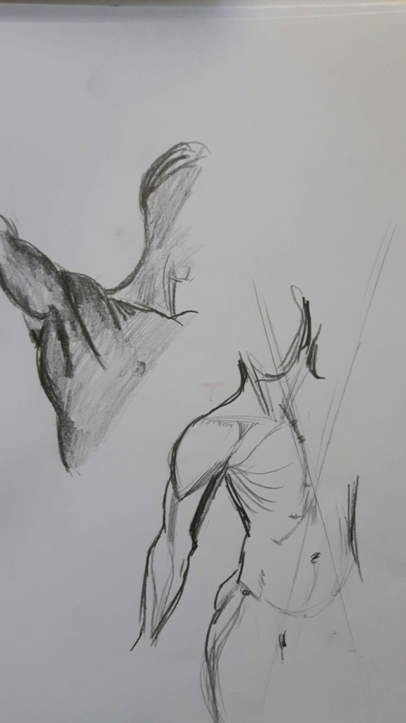 I think I created a sense of weight in pictures 3. and 4. The arms too long in 3. and 4. was tricky to draw (but somehow the most enjoyable) then he moved quickly (no power on Earth could move him back to the same position) so I couldn’t reproduce the shoulder part well. I kept erasing but each time it got worse and I gave it up. But still that was the best position because the figure is expressing playfulness.