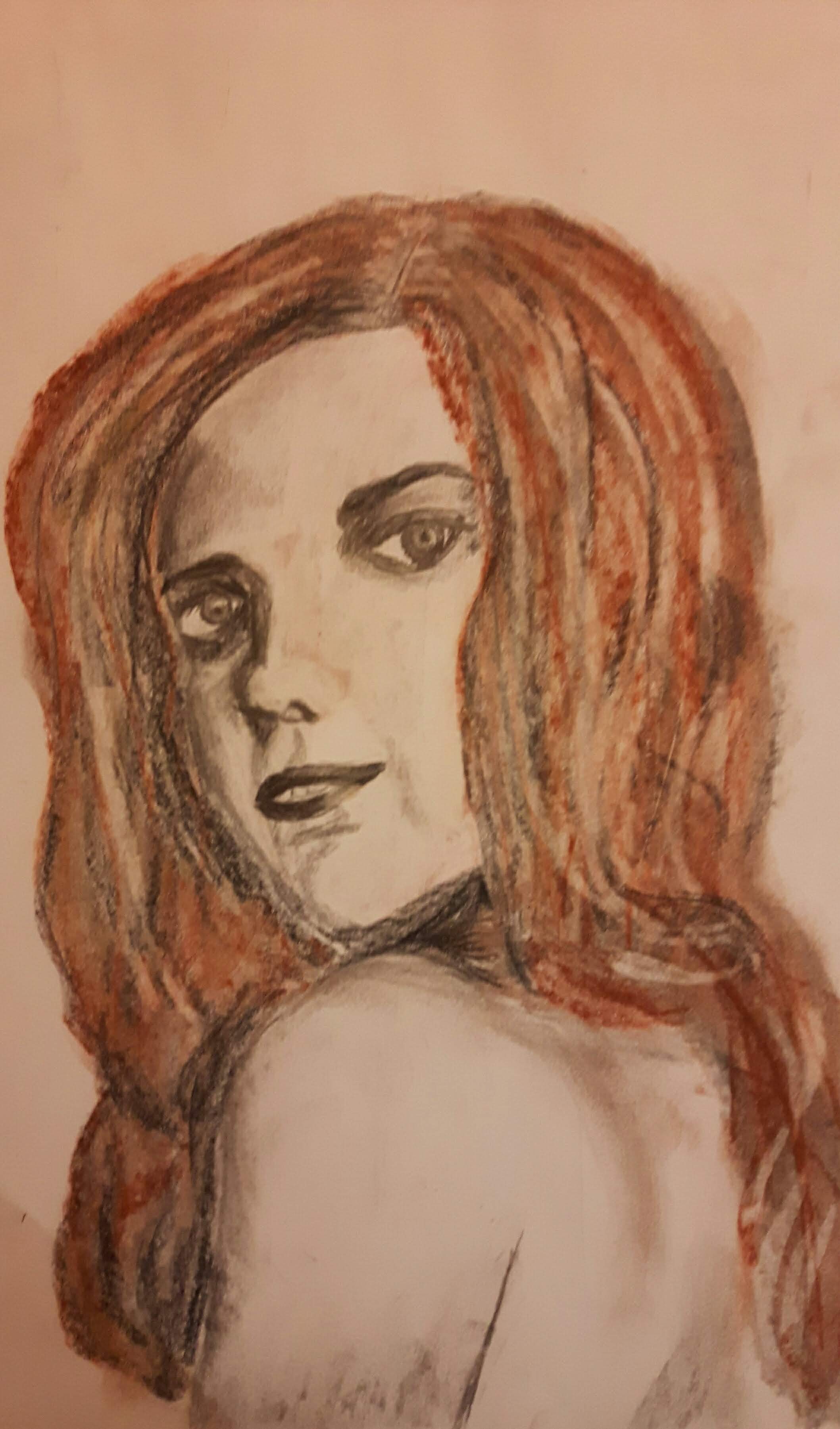 The last one was a young girl looking back over her shoulder I thought the pose was interesting to draw. I used mixed media, crayons and pencils with shades of sanguine and black.