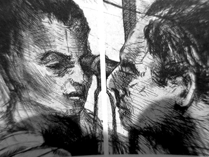 I was a bit afraid to fill this large piece of paper with only lines, I thought there would be disturbing “empty holes” but somehow the paper was just enough for this composition. I found difficult to depict the facial expression. I tried to put the shades with not much success. Overall I think there are slight problems with proportion but I like the composition and the chosen medium worked out well, too.